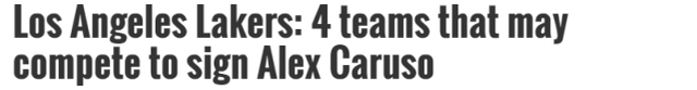 NBA季后赛正在进行,对于湖人队来说,下个赛季的补强将是球迷和媒体关注的焦点,很明显,湖人本赛季的引援可谓惨淡,但卡鲁索却成为湖人球迷最希望留下的角色球员,有防守、有反击、有组织、有活力,但不可否认,人家卡鲁索也是赚钱养家的,根据之前的报道,卡鲁索的期望年薪是1200-1300万美元,这样的价格让湖人很为难,美媒lakeshowlife也是列出了卡皇四大潜在下家,下面一起看看详情。