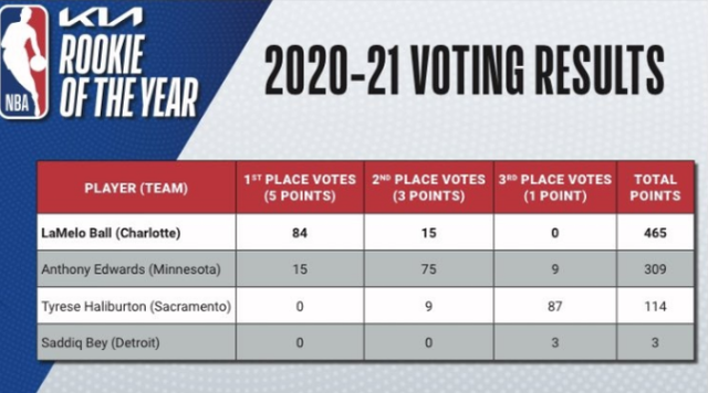 在最佳新秀的投票当中,三球收获84张第一选票和15张第二选票,合计收获465分。反观爱德华兹15张第一选票与75张第二选票,合计309分,比三球少了足足156分差距巨大。至于哈利伯顿9张第二选票与87张第三选票获得114分,萨迪克-贝一张第三选票得到3分,而其余新秀球员没有获得选票。