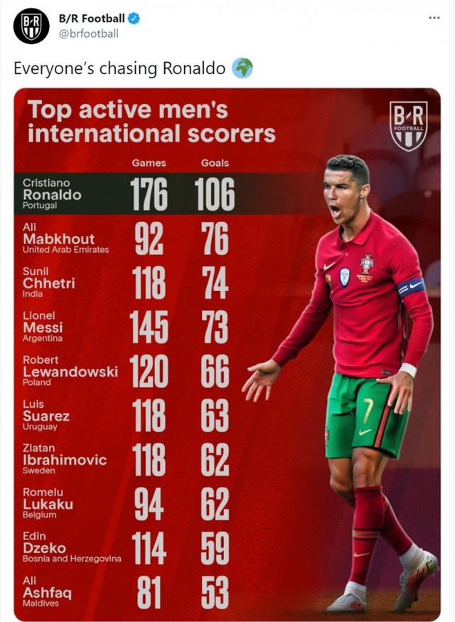 直播吧6月17日讯 B/R Football给出了最新的、现役球员国家队进球数排行前十的统计(配文:所有人都在追赶C罗),其中C罗以106球高居榜首。