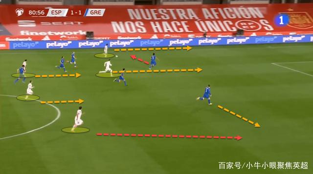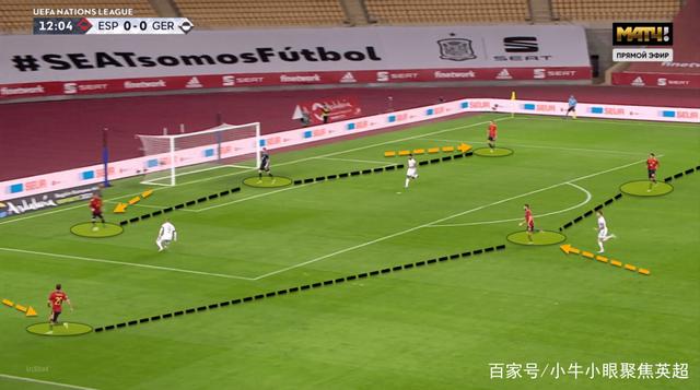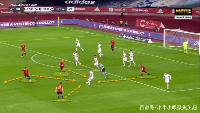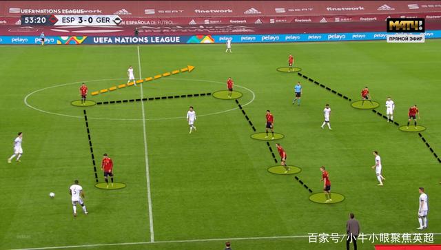 西班牙队在防守阶段并不会一直保持同样的防守阵型,球员会根据对方球的移动而不断调整自己的防守站位。在上图的比赛画面中,右翼的托雷斯通过前移与莫拉塔形成了双人高位施压的站位,而西班牙的阵型也从4-5-1暂时变成了4-4-2。当德国队将球重新转移回中路区域时,托雷斯又通过重新后撤将阵型变回了4-5-1。西班牙队能够根据对手的进攻重心不同而不断调整防守策略,而这种灵活的位置变化也让对方很难在第一时间找到进攻的突破口。