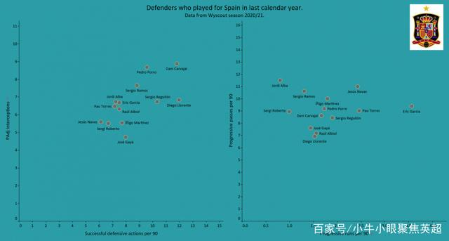 西班牙队的后防线是迄今为止三条线中表现最稳定的。从下面的图表中,我们可以看到西班牙队的后卫球员在控球方面表现得非常出色。尽管卡瓦哈尔在每90分钟的防守成功率和拦截成功率方面表现最好,但恩里克仍然将进攻能力更加突出的略伦特视为右边后位的首发人选。