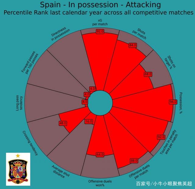 由于对手在防守端总是会堆砌很多的防守球员,这使得这些锋线球员根本没有前插的空间,同时也使得那些有创造力的球员更难创造出好的进攻机会。由于西班牙面对的球队一般在防守端会回撤地很深,这使得他们在禁区外拥有大量的远射空间,远射的进球成功率显然要低于在禁区内的射门成功率,这也是他们的射门转化率不高的原因之一。
