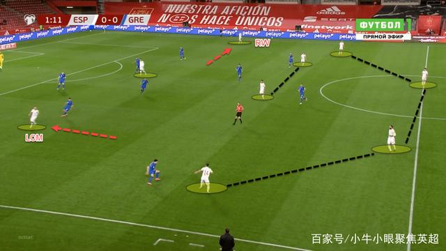当西班牙将进攻推进到对方半场后,他们的阵型会再次进行微调。在下图的比赛画面中,我们能够看到当对手的防线退得很深时,西班牙队的四名后卫始终保持在中线附近通过传球来保持控球权,同时双后腰会将位置前移到与对方锋线平行的位置,而两名边锋则通过向边线移动来保持进攻的宽度,这使得西班牙的阵型看起来更接近于4-2-1-3。