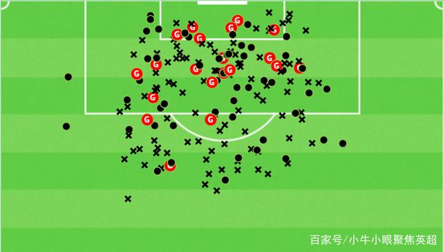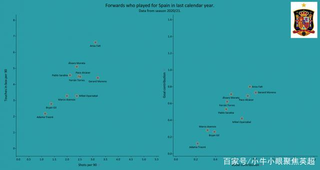 在下面的散点图中,我们能够看到西班牙锋线球员的实际进球贡献和预期进球贡献的比例并不高,这主要是因为他们中的大部分球员都来自巴萨,而巴萨的战术主要以传控位置。巴萨所面对的大多数球队在防守端都会后撤得很深,而对手在防守阶段通常会排出4-5-1、5-3-2和5-4-1的防守阵型,这在一定程度上也扼杀了这些锋线球员制造杀伤的机会。