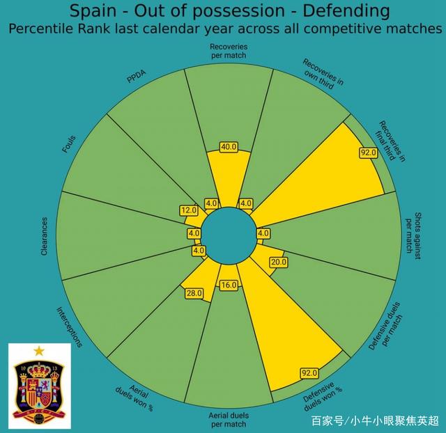西班牙队在防守阶段也表现得非常积极,较低的PPDA值也意味着恩里克的球队在防守阶段会通过非常有侵略性的高位施压来尽快地夺回控球权。