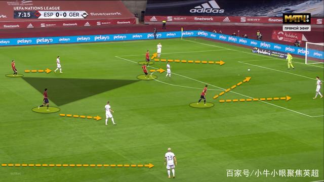 在上图的比赛画面中,西班牙队在前场丢球后处于由进攻向防守过渡的状态。我们可以看到离对方持球球员非常近的西班牙球员并没有选择在第一时间后退,而是在对方持球球员周围形成了一个小范围的包围圈,这使得对方持球球员不能第一时间将球转移给队友,同时也为防守球员创造了更多的回防时间。