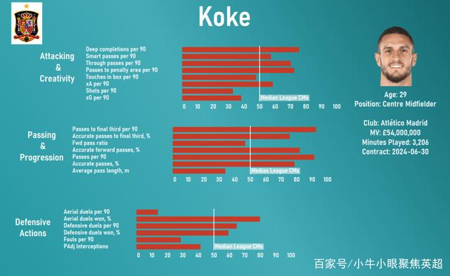 尽管科克在中场的站位较深,但他每90分钟的关键传球和到最后三分之一区域的传球次数仍然高于西甲联赛的平均水准。科克在渐进传球方面也给人留下了深刻的印象,他每90分钟到最后三分之一区域的传球成功率也远高于西甲中场球员的平均水平。