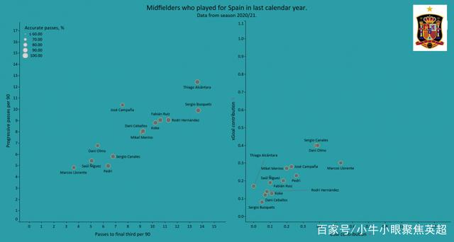 西班牙的大部分中场球更员擅长为后卫创造出球的空间并最终将球过渡给锋线球员,布斯克茨和蒂亚戈就是最典型的例子,他们每90分钟的渐进传球和到最后三分之一区域的传球次数也都排在了西班牙国家队的前两位。尽管西班牙队的中场球员能够为锋线球员源源不断地送出助攻,但在进球贡献和预期进球贡献方面,西班牙队的锋线球员在最后三分之一区域的效率并不高,这也是恩里克在欧洲杯决赛阶段需要解决的问题。