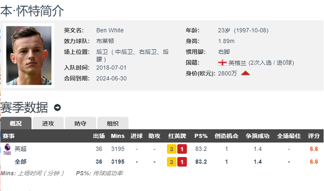 现年23岁的本-怀特,身高1.89米,出自南安普顿青训,2014年转入布莱顿青年队,如今已经成长为一位英格兰国脚,还入选本次英格兰欧洲杯大名单。本-怀特是一位后场万金油,可以踢中卫、右后卫和后腰。本-怀特本赛季一共为布莱顿出战了36场英超的比赛,全部首发出战。本-怀特与布莱顿的合同在2024年到期,目前球员在德转的身价为2800万欧元。