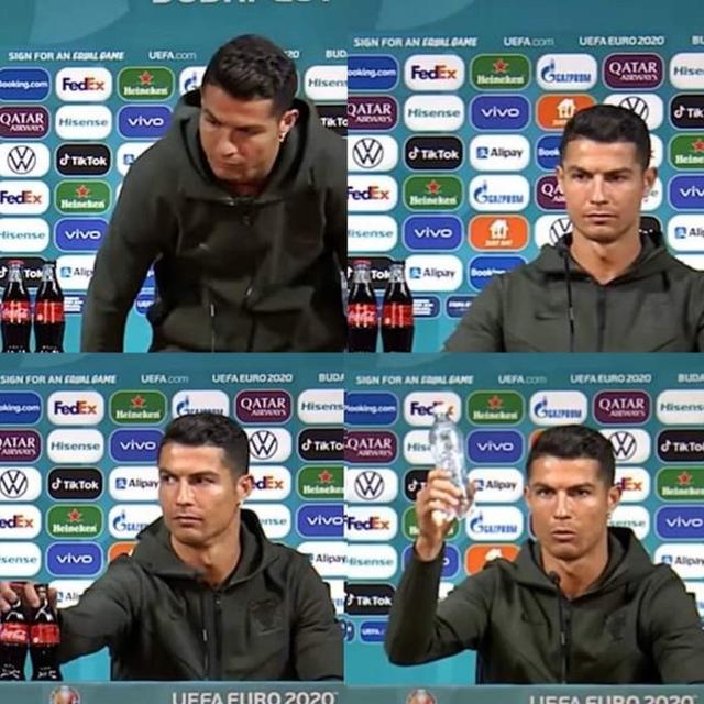 C罗、博格巴、洛卡特利分别在新闻发布会上移走了赞助商的饮料,包括可乐和啤酒。