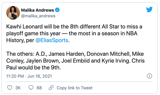 据美媒沙姆斯-查拉尼亚的说法,快船前锋科怀-伦纳德因为膝盖伤势很可能缺席快船对阵爵士系列赛剩余的比赛。而据ESPN记者马利卡-安德鲁斯的说法,伦纳德缺席系列赛第5场比赛的情况下,他也成为今年季后赛垫底8位缺席季后赛的全明星球员,这是联盟的最高纪录: