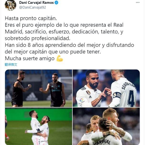 卡瓦哈尔写道:再见队长,你是纯粹可以代表皇马的人,牺牲、努力、专注、天赋,尤其是职业性,这8年时光是我可以从一个队长身上学到最多最享受的日子,好运朋友。
