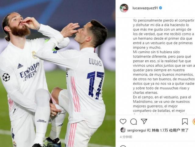 巴斯克斯写道:我在个人方面失去了一个和我享受每一天的朋友,一个从我来到皇马一队第一天就对待我如同兄弟一样的朋友,如果没有你,我的职业生涯将会完全不同。