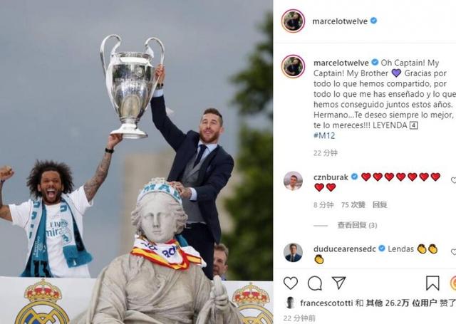 马塞洛写道:哦队长!我的队长,我的兄弟,感谢你分享的一切,感谢你教会我的一切,感谢我们并肩作战的这些年,兄弟……我祝你永远好运,你配得上!!!传奇。