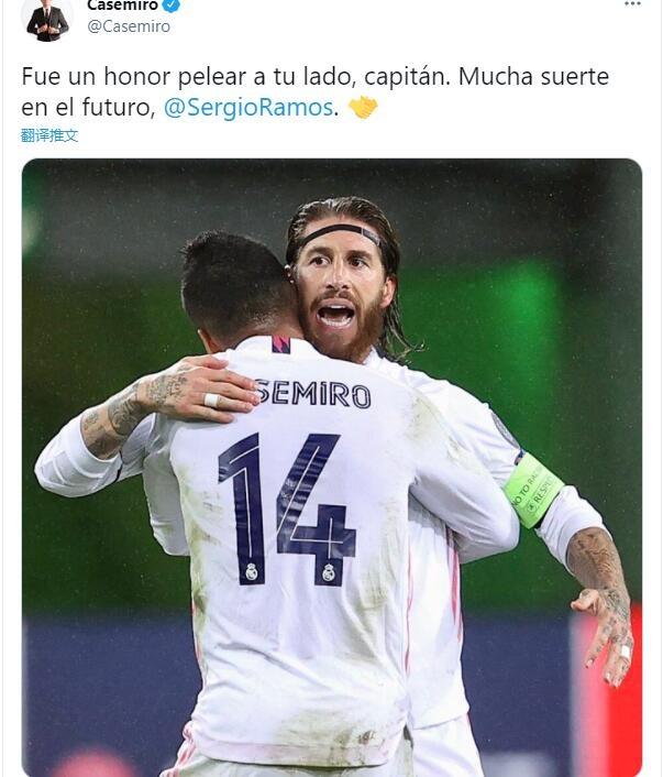 卡塞米罗写道:和你并肩作战是一份荣耀,队长,未来好运@拉莫斯。