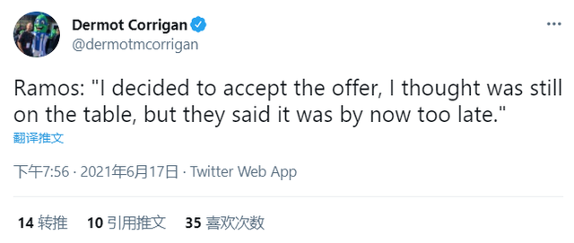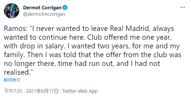 在西甲名记德莫特看来,拉莫斯的这番话,是在朝皇马开火(shots fired )。水爷也是告诉全世界,自己离开皇马,并非是贪图其他俱乐部的高薪和签字费,而是皇马做得太绝……