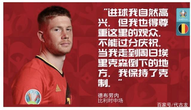 比利时队本场比赛2-1逆转丹麦队拿下开门红,德布劳内一传一射,而进球后的德布劳内也没有疯狂庆祝,他说道“我很高兴能进球,但我非常尊重这里的对手和球迷,所以不会疯狂地庆祝。我走到了上周六埃里克森倒下的那块区域,我也保持了冷静。”