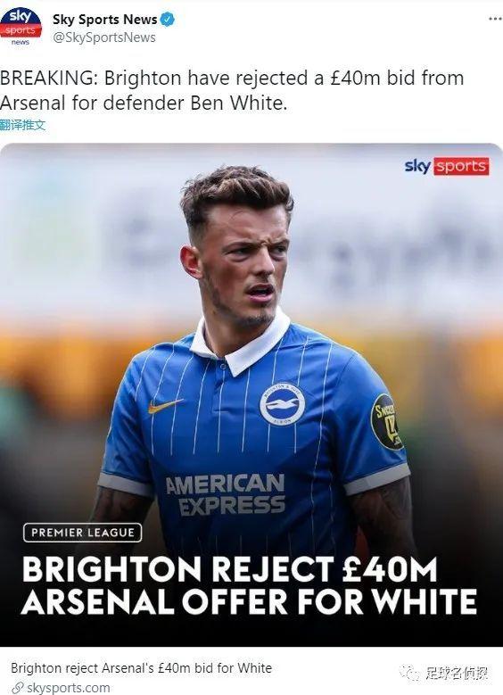 Goal记者CWS发文,阿森纳已经为本怀特提交了一份价值4000万英镑的初始报价,不过遭到了布莱顿的拒绝。