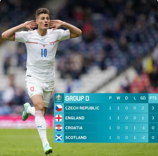 D组:捷克和英格兰3分领跑,克罗地亚和苏格兰都是0分。第2轮对阵是克罗地亚VS捷克,英格兰VS苏格兰。捷克和英格兰再拿1分就很大概率出线了。