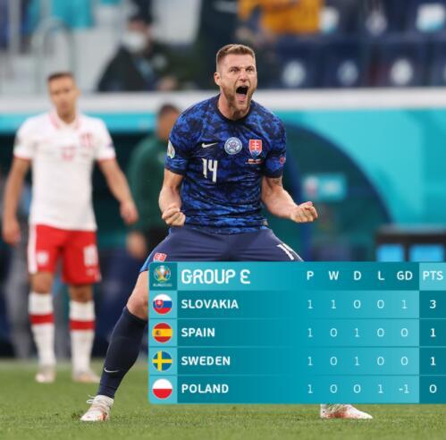 E组:斯洛伐克3分领跑,他们本轮面对瑞典,而另一组对碰是西班牙踢波兰。斯洛伐克只要不输,就大概率出线,剩下的三支球队西班牙、瑞典和波兰都输不起。