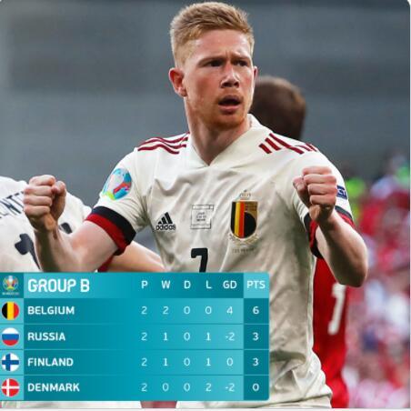 B组:比利时2战全胜提前出线,俄罗斯和芬兰都是3分,只有丹麦是一分未得。比利时最后一轮拿下欧洲杯新军芬兰应该没什么问题。另一边是垫底球队丹麦踢小组第二的俄罗斯。由于同分的情况下是依次算相互战绩、相互净胜球和相互进球数,在比利时战胜芬兰的前提下,丹麦最后一轮大胜俄罗斯的话,甚至是有可能以小组第二的身份出线的。届时这个小组将会出现三队同积3分的情况。