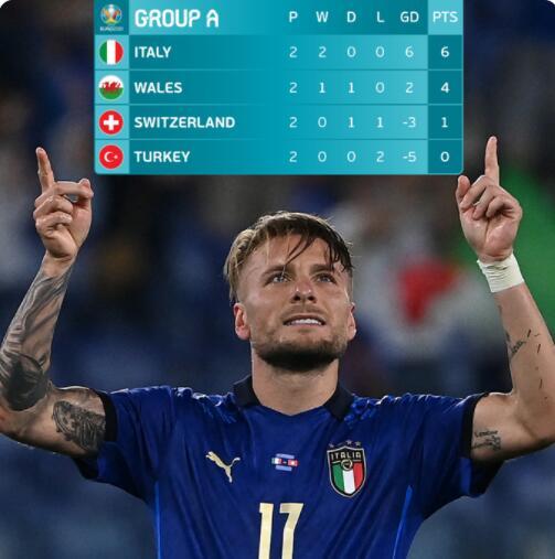 A组:意大利6分提前出线,威尔士4分基本也稳了。不过土耳其0分还没有出局,因为他们最后一轮战胜瑞士的话仍然能以3分排在小组第3,仍有争夺最好小组第3出线的希望。上届欧洲杯冠军葡萄牙在小组就是3分出线的。不过土耳其现在的净胜球为-5,他们不仅要全取3分而且还要大胜才有机会出线。另一方面,瑞士在土耳其身上拿到3分的话,就很有机会出线了,甚至可能反超威尔士拿到小组第二。