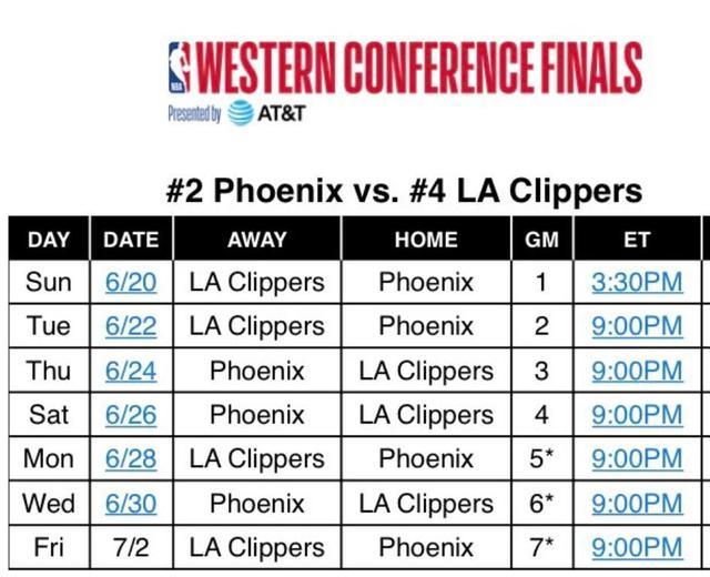 NBA官方公布了西部决赛赛程:(*如有需要)