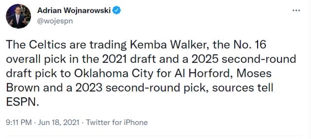 沃神爆料,绿军和雷霆完成了3换3交易,凯尔特人送走了沃克,今年的首轮签和2025年的次轮签,雷霆则送走了霍福德和布朗,以及23年的一个次轮签,交易达成以后,霍福德重回老东家绿军,沃克则远赴俄城,霍福德这个赛季在雷霆过得不算愉快,雷霆为了摆烂,霍福德赛季后半段几乎没有出场,这一次重新回到绿军,霍福德总算是有了用武之地,塔图姆重新赢回了内线好帮手。值得一提的是,这是常规赛结束之后,目前为止最大的一次交易。