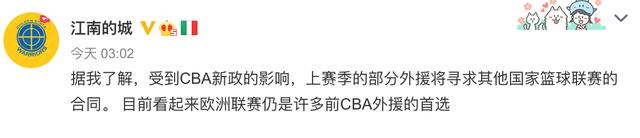 另外,据国内媒体人透露,目前多数CBA外援都倾向于去欧洲赛场打寻新合同:“据我了解,受到CBA新政的影响,上赛季的部分外援将寻求其他国家篮球联赛的合同。 目前看起来欧洲联赛仍是许多前CBA外援的首选。”