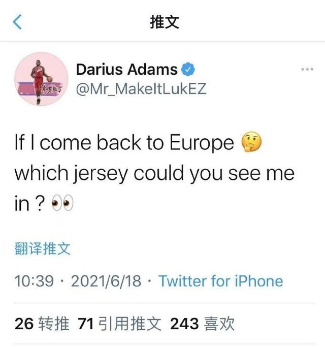 而由于CBA联赛暂时没有工作,多位CBA外援目前倾向于到欧洲赛场找工作,青岛队外援亚当斯在个人社交网络上写道:“如果我回到欧洲联赛效力,那么希望看到我穿哪一件球衣?”在来到中国打球挣钱之前,亚当斯就有过多年欧洲赛场征战经历,还拿过得分王,那是一个适合他的舞台。