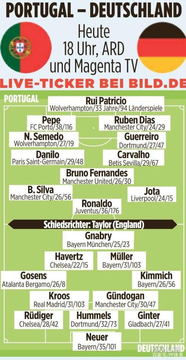 北京时间6月20日0:00,葡萄牙与德国将进行一场欧洲杯小组赛的关键战。赛前,德国《图片报》预测了本场比赛的首发。德国方面,他们可能还是要使用无锋阵,而葡萄牙方面C罗还是会毫无疑问地首发登场。