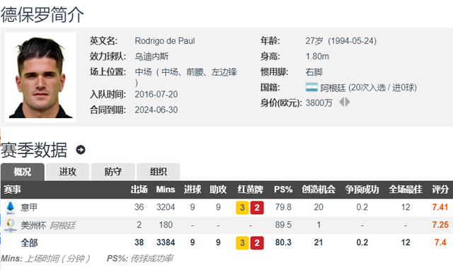 现年27岁的德保罗,本赛季一共为乌迪内斯出战了36场意甲的比赛,打入了9个进球,还有9次助攻。德保罗与乌迪内斯的合同在2024年才到期,目前球员在德转的身价为3800万欧元。