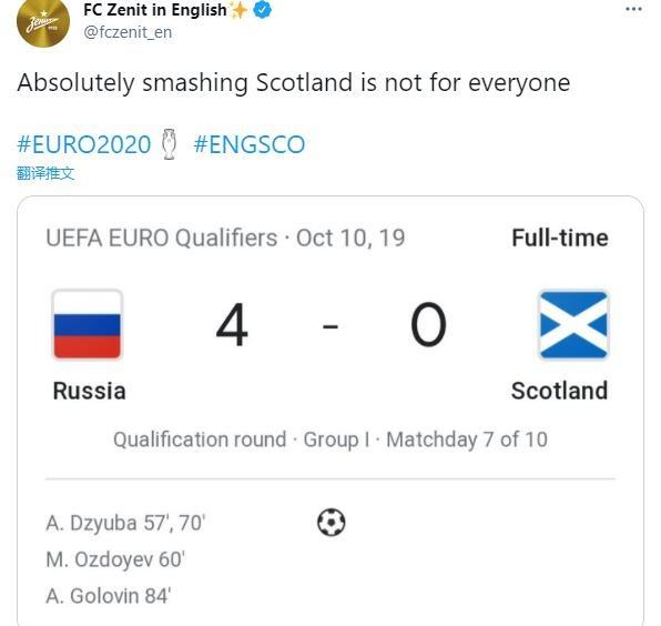 直播吧6月19日讯 今天凌晨的欧洲杯英格兰0-0战平苏格兰,赛后俄超豪门泽尼特官推发文调侃:“不是所有人都能暴揍苏格兰。”