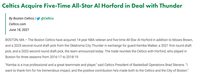 而史蒂文斯担任总经理后的首个举动就是推动涉及肯巴-沃克的交易,据报道,凯尔特人已经在送出肯巴-沃克、第16顺位选秀权和2025年次轮选秀权的情况下从雷霆手中换回艾尔-霍福德,摩西-布朗和2023年的次轮选秀权。