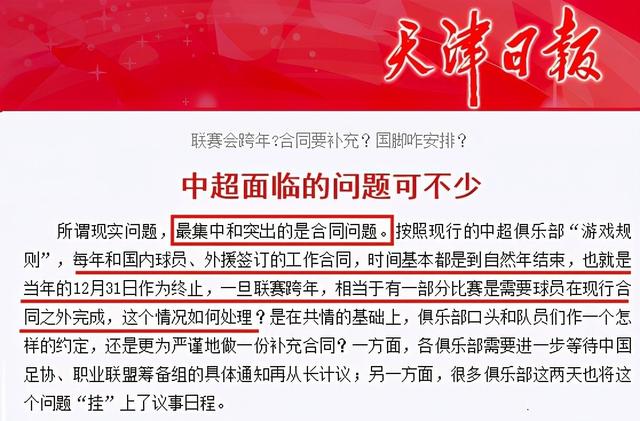 因而,目前外界比较倾向于跨年的方式,也就是说中超有可能要踢到明年的1月中旬左右才会结束,这样一来的话,各俱乐部就会面临一个非常棘手的问题,按照以往的签约习惯,多数球员的合同会签到12月底,而此番遇到跨年的话,俱乐部就会遇到球员合同到期但比赛却没有结束的情况。