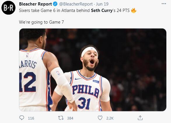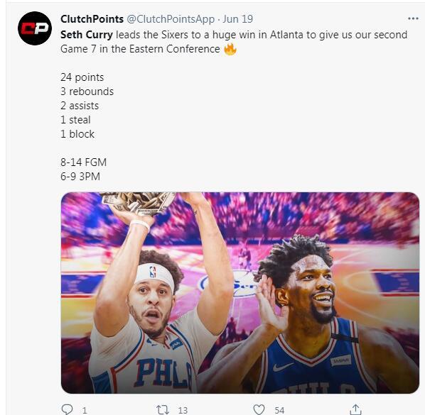 北京时间6月19日,费城以104-99击败老鹰拿下关键的G6两队进入抢七。这场比赛首节费城一度落后12分但在第三节费城实现了反超,引来反超高潮的球员就是塞思-库里,他实在是太准了,他延续了上一场比赛的良好手感,他拿下24分+6个三分球是此役赢球的超级功臣。