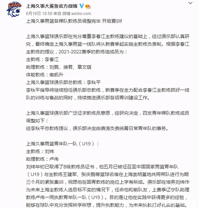 近日,上海男篮在官方微博宣布球队开启夏训,并同时公布了球迷们比较关注的球队各梯队教练员人选,上海久事男篮的主教练由李春江担任,助理教练由刘鹏、接君等人领衔,李秋平担任球队的总教练,新赛季的主要任务是抓好球队各项青训工作,全力配合李春江!与此同时上海男篮还公布了U13、U15、U17、U19四支青年梯队的教练员人选,其中非常重要的U19青年一队主教练由上海男篮名宿刘炜担任,上赛季辅佐杨鸣的卢伟此次同刘炜搭档,担任U19青年队的助教,这也预示着退役有两年时间的刘炜正式出山,他将同时担任上海男篮U19一队主教练和国家青年队的教练。说到这里可能很多球迷有点迷糊了,刘炜怎么又担任了国青队教练了?其实在上海官方宣布刘炜担任球队青年队教练的时候,也同时宣布了另一个消息,那就是刘炜在今年5月份的时候,就已经被征召到U19国青队担任教练了,他将联手张庆鹏一起辅佐国青队主教练王建军!