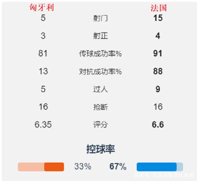 此役法国队控球率达到了67%,射门数达到了15脚,却仅仅打进1粒进球,而且这粒进球还是法国队利用对手主罚定位球回防不及时,通过反击打进。