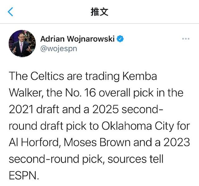 北京时间6月19日,NBA赛场正式传来夏天的第一笔人员交易。据Woj报道,肯巴沃克被交易到雷霆,同时送出2021年16号顺位以及2025年次轮签,得到霍福德+摩西布朗+2023年次轮签。