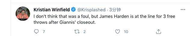 但是,篮网跟队记者Kristian Winfield就表示,“我不认为那是一次犯规,但是詹姆斯-哈登现在走上了罚球线,准备执行三次罚球。”专家Kirk Goldsberry也表示,哈登得到这样的哨对雄鹿来说不是好的信号。