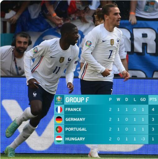 F组:这个死亡之组,匈牙利在2轮过后还没死掉,只有法国4分在手稳了,德国和葡萄牙仍然需要1分。