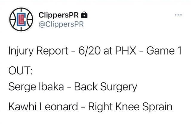 在赛前两队却同遭遇重创,快船更新了最新的伤情报告,伊巴卡和莱昂纳德将缺席首场比赛。这当中伊巴卡已经赛季报销,莱昂纳德则是在半决赛G4造成膝盖伤势,随后缺席G5和G6,好在球队都赢下了比赛。可在西决首战,莱昂纳德因为右膝扭伤将缺席,具体的伤情并没有公布。主帅泰伦卢表示:“不确定小卡能不能出战G2,同时他会假定小卡不会出战这轮系列赛来排兵布阵。”