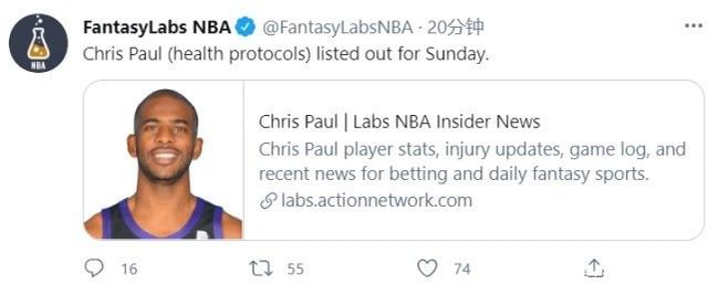 随后太阳队也公布了伤情报告,其中最让外界关注的保罗,他将因为盟健康与安全协议缺席本场比赛。在太阳晋级到西决后,保罗突然出现状况,触发了安全协议,进入到无限期休战状况。据外界的报道,保罗的检测呈阳性,处于隔离状况。