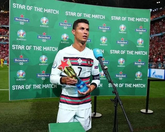 在欧洲杯匈牙利对葡萄牙比赛前的新闻发布会上,C罗作出了一个令人意想不到的举动,他把身前桌子上的两瓶可口可乐移到了一边,然后举起水瓶示意。