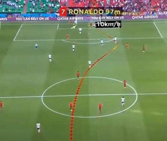 36岁的C罗14.2秒纵贯两个禁区,跑动97米,最高冲刺时速达到了32km/h。