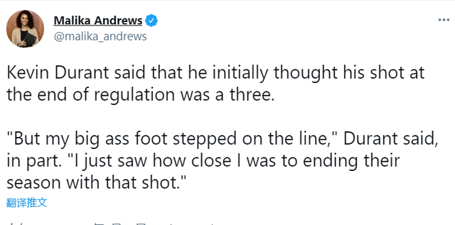 赛后,杜兰特谈到这个球也爆了粗口。他表示:“我该死的脚,踩线了!原本我已经看到了我那次投篮终结这轮系列赛的希望了。”的确,杜兰特在被裁判认定这球是2分之后,自己也是做了一个鬼脸,表达遗憾。但命运有时候就是这么有趣,他给了你2分追平,但没有给你全部。而最终这个2分对于比赛无益,却让杜兰特在这一刻赢得了所有人的尊重。