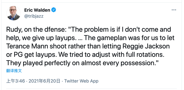 最后需要谈及的是,爵士当家中锋鲁迪-戈贝尔谈及在对阵快船系列赛第6场比赛中自己在防守端的尴尬表现:
