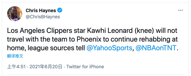 “消息人士称,快船球星科怀-伦纳德(膝盖伤病)不会跟随快船前往太阳主场并且继续留在洛杉矶处理伤病。”