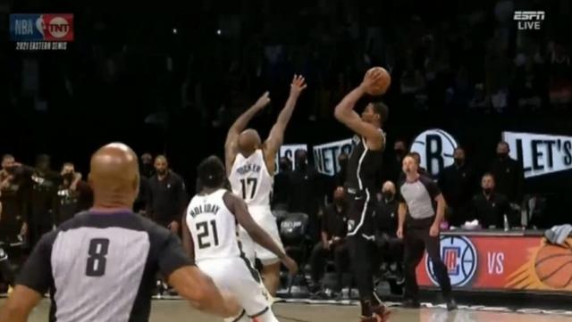 篮网雄鹿第四节篮网的最后一攻,杜兰特接球面对塔克防守,转身超高难度后仰跳投绝平。