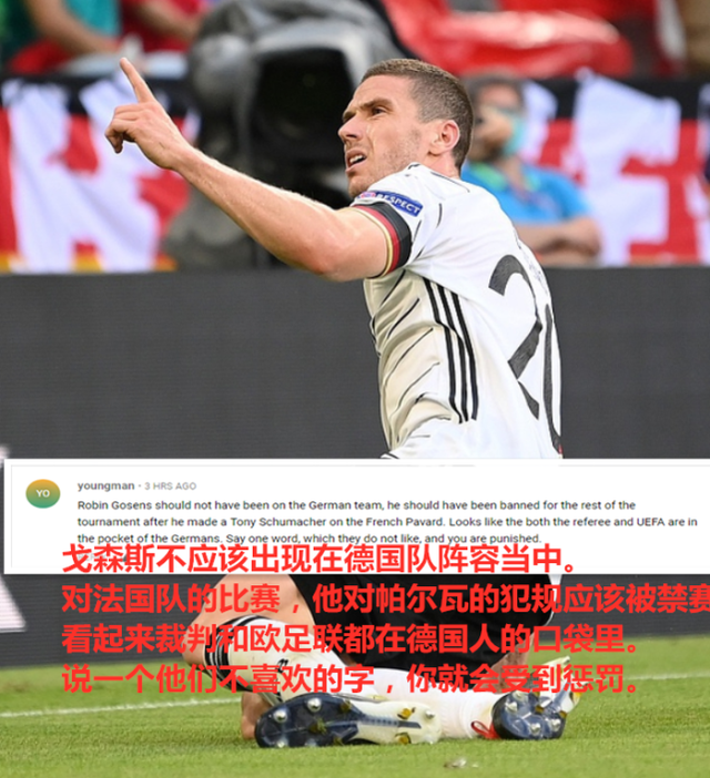 该球迷表示:“戈森斯不应该出现在德国队阵容当中。对阵法国队的比赛,他对帕尔瓦的犯规应该被禁赛。看起来裁判和欧足联都在德国人的口袋里。说一个他们不喜欢的字,你就会受到惩罚。”